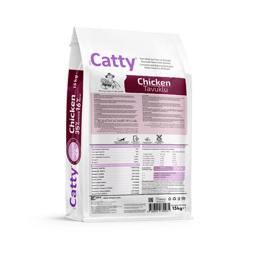 Tüm ırklardan yavru kediler için hazırlanmıştır.Catty Kitten;12 aya kadar, sütten kesilmiş ve hassas sindirim sistemine sahip yavru kedinizin; sağlıklı gelişimini ve bağışıklık sisteminin güçlenmesini desteklemek üzere formüle edilmiştir.