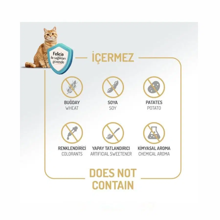 Felicia tavuklu kedi maması, hamile, süt veren anneler ve yavru kediler için düşük tahıllı ve hypo alerjenik formüllü olarak hazırlanmış kuru kedi mamasıdır.