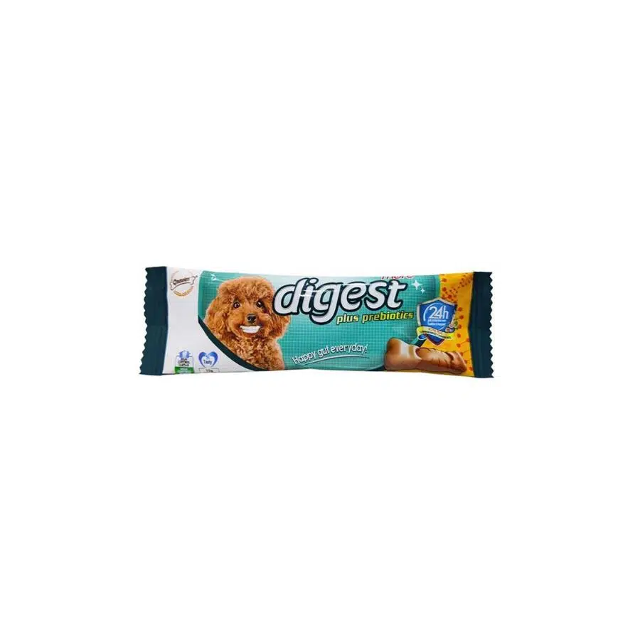 Digest More Dental Treats ile, köpeğiniz sadece üstün ağız sağlığına kavuşmakla kalmaz, aynı zamanda bileşimlerinden dolayı tüm vücut sağlığından da fayda sağlar. Tedavi şekli köpeğiniz için oldukça uygun olup, şekli de çiğnemeyi kolaylaştırır. Köpeğinizin eğitimi sırasında veya birlikte vakit geçirirken, ona bu lezzetli ve ağız sulandırıcı ödülleri sunarak faydalı içeriklerle beslenmesini sağlayabilirsiniz. Doğal İçerikler Ödül mamaları, köpekleri yapay bileşenlerin sert etkilerinden korumak için tamamen doğal içeriklere sahiptir. Prebiyotik İçerir Sağlıklı bir bağırsak florasını destekler ve düzgün sindirim sağlar. Lezzetli Tat Köpeklerin ağzını sulandıran kokusu ve tadı ile ödülleri vermek daha kolay hale gelir. Digest More Dental Treats, tamamen doğal bir köpek mamasıdır. Prebiyotik içerdiği için sindirim sağlığını destekler. Bu lezzetli ödülleri köpeğinize vererek onu eğitebilirsiniz! İçindekiler arasında bezelye unu, patates tozu ve balık yağı yer alır. Ayrıca, bağırsak sağlığını iyileştiren prebiyotikler de içerir. Bir dozaj olarak, günde bir ödül yeterlidir. 6 aydan küçük köpeklere bu ödülleri vermeyiniz. Analiz: Ham protein: %6.16 Ham yağ: %7 Ham lif: %11.5 Ham kül: %2,5 Nem: %12.7 Kalsiyum: %0.158