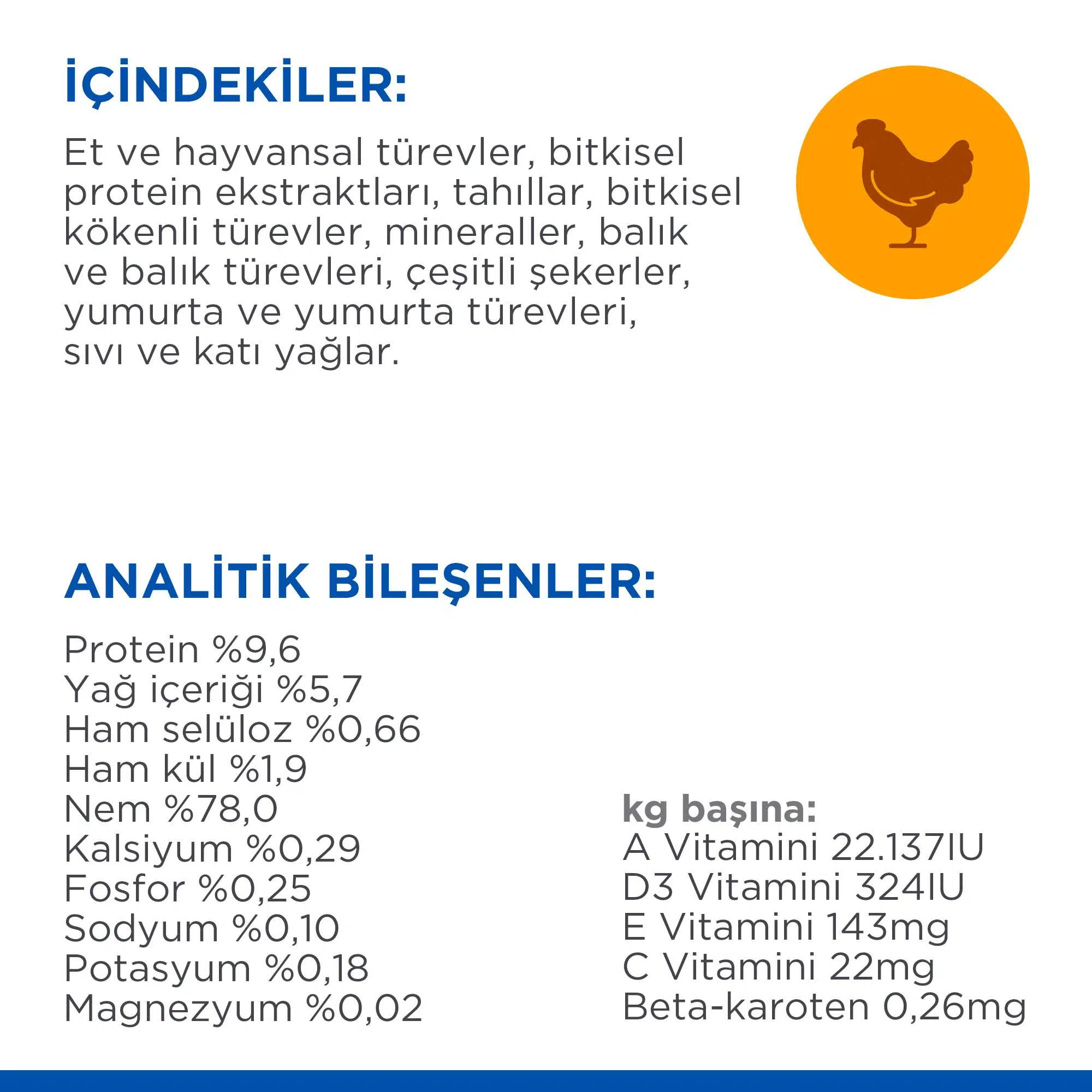 İçindekiler: Tavuk, Manyok Nişastası, Mısır Nişastası, Bezelye Proteini konsantresi, Buğday Unu.