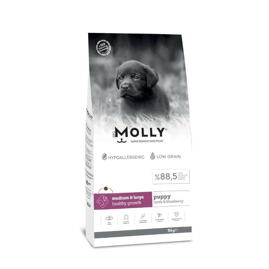 Molly ‘’Healthy Growth’’ köpek maması orta ve büyük ırk yavru köpekler için profesyonel beslenme uzmanları tarafından özenle formüle edilmiş ve yüksek kaliteli içeriğinden dostlarımızın tam olarak faydalanması hedeflenerek ileri ekstruder teknolojisi ile üretilmiştir. Yavru köpeğinizin sağlıklı bir metabolizma ve kemik gelişimini desteklemek üzere Omega-3 yağları ve temel mineral ve vitaminler ile zenginleştirilmiştir.