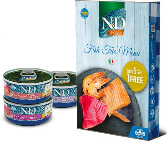 Paket içerisinde 2'şer adet N&D Ton Balıklı Yetişkin Kedi Konservesi 70gr, N&D Ton Balıklı ve Somonlu Yetişkin Kedi Konservesi 70gr ve N&D Ton Balıklı ve Karidesli Yetişkin Kedi Konservesi 70gr olmak üzere toplam 6 adet konserve vardır.