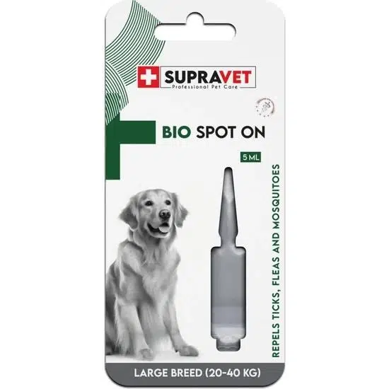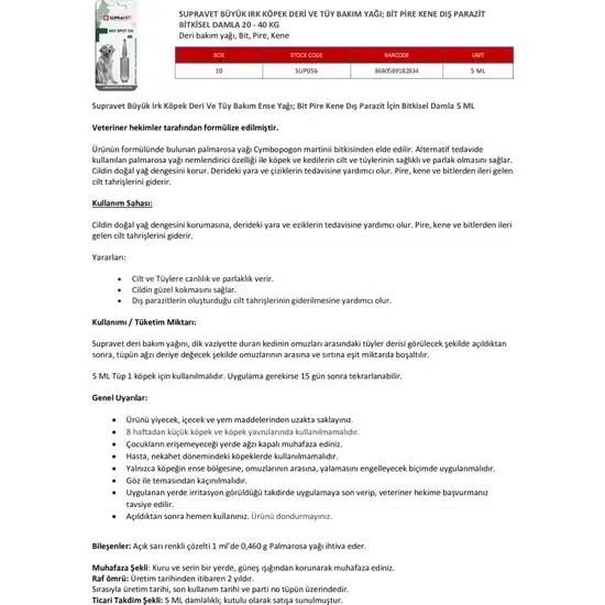 | Etiketler | Supravet Büyük Irk Köpek Deri ve Tüy Bakım Yağı; Bit, Pire, Kene Dış Parazit Ense Damlası 20-40 kg (5 ml) |