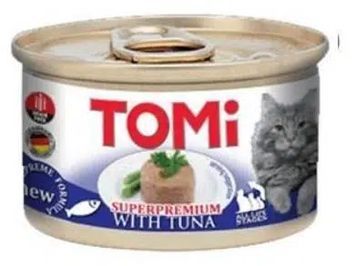 Tomi Super Premium serisi mamalar GDO içermez. İçerik: Ton balığı eti ve ürünleri ` sebze minaral ve Vitamin D3 250 IU , Vitamin E 15 mg 7 mr , Taurin 445 mg / mr , Biotin 20 ug /ur