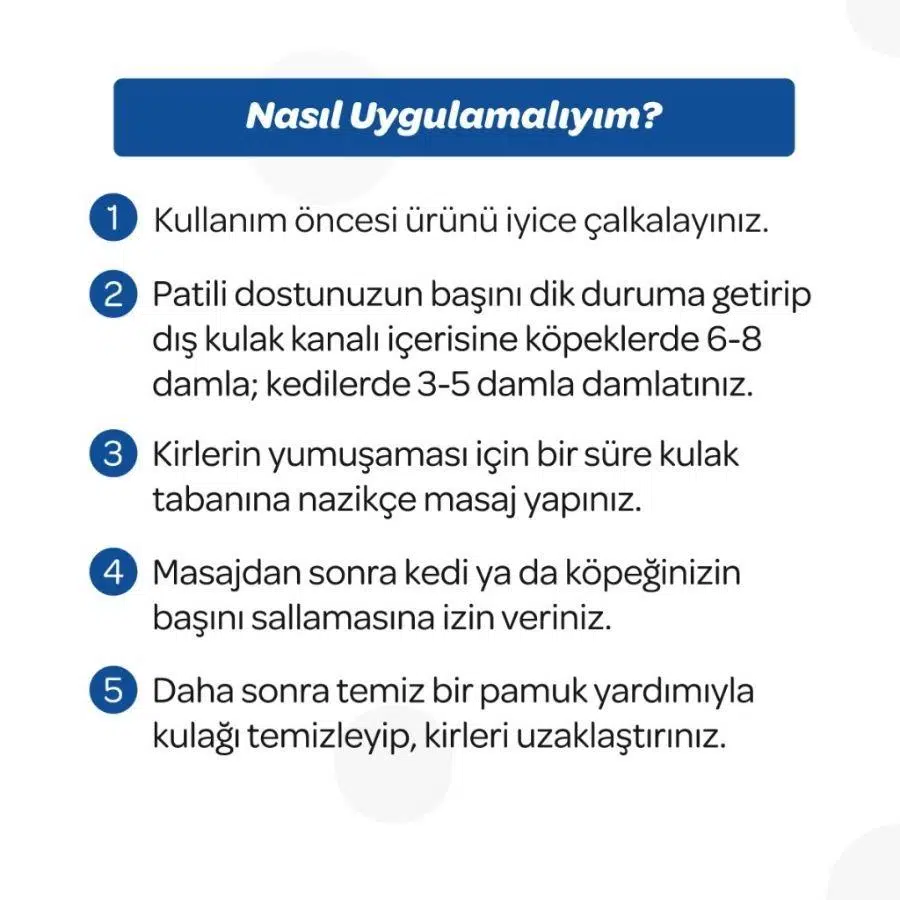 Kullanım öncesi ellerinizi yıkayınız. Ürünü iyice çalkalayınız. Hayvanın başını dik duruma getirip dış kulak kanalı içerisine köpeklerde 6-8 damla; kedilerde 3-5 damla damlatınız.